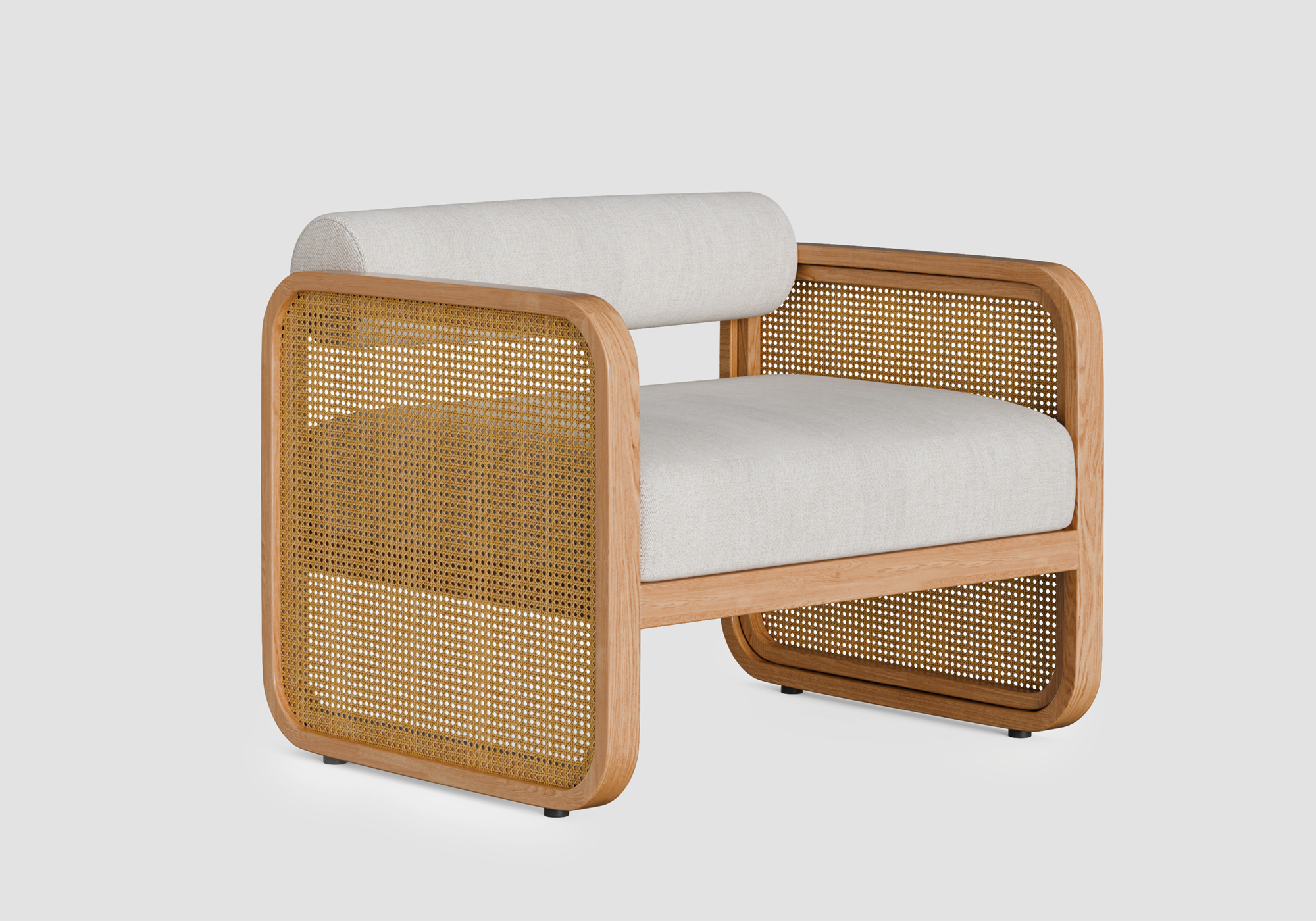 Curved wooden frame inset with textural rattan panels and dressed with comfortable pillows