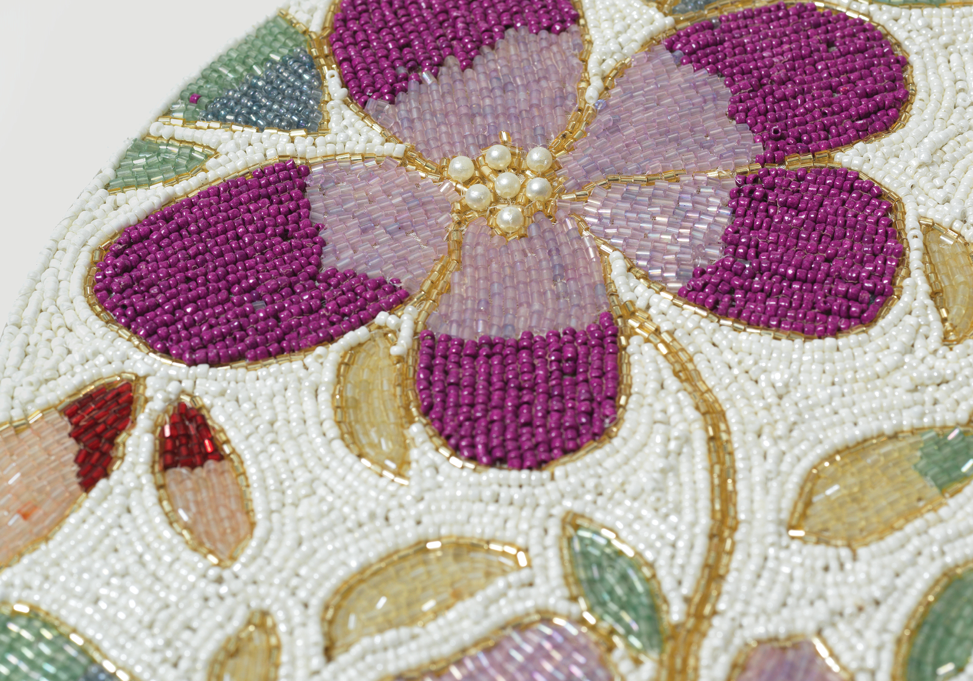 Handmade beaded placemat with multi color floral design.
